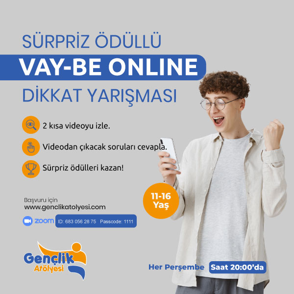 VAY – BE (Oyun Hediye Belgesel Eğlence) yarışmasına katılabilmeniz ve ödüllerinizi ulaştırabilmemiz için başvuru formunu doldurup başvuru yapmanız gerekmektedir. Yarışma öncesi hatırlatmaların yapıldığı Whatsapp grubumuza katılabilirsiniz. Ayrıca zoom adresimiz sürekli paylaşılmaktadır.